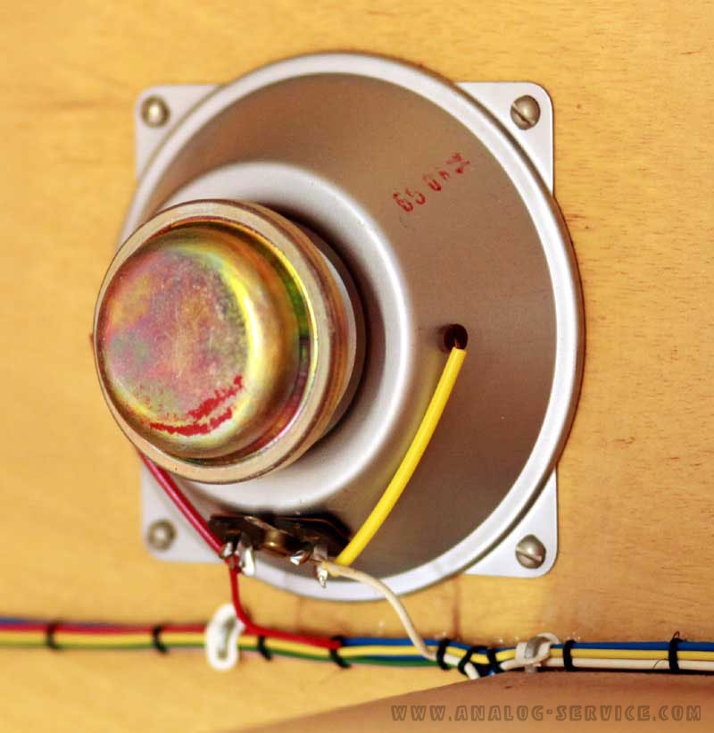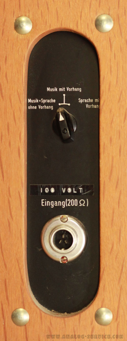 Der Lautsprecher ist unverbastelt, alle Bauteile sind noch original. Lediglich am dreipoligen Großtuchelanschluss hat jemand die beiden Schräubchen entfernt, womöglich um ihn ohne passenden Gegenstecker zu betreiben. Ansonsten ist das Gehäuse von außen mittelmäßig verschutzt und hat auch einige Kratzer abbekommen. Es wurde für diese Bilder auch nicht gereinigt.