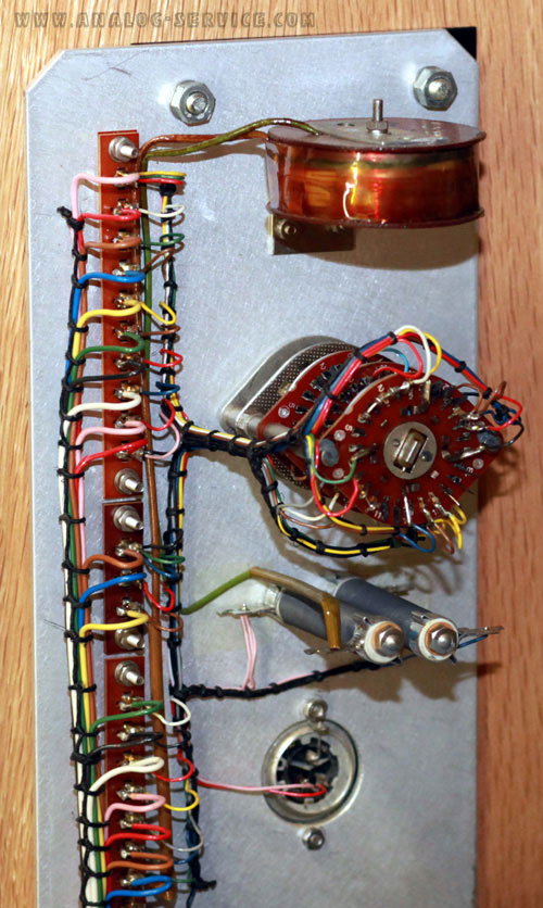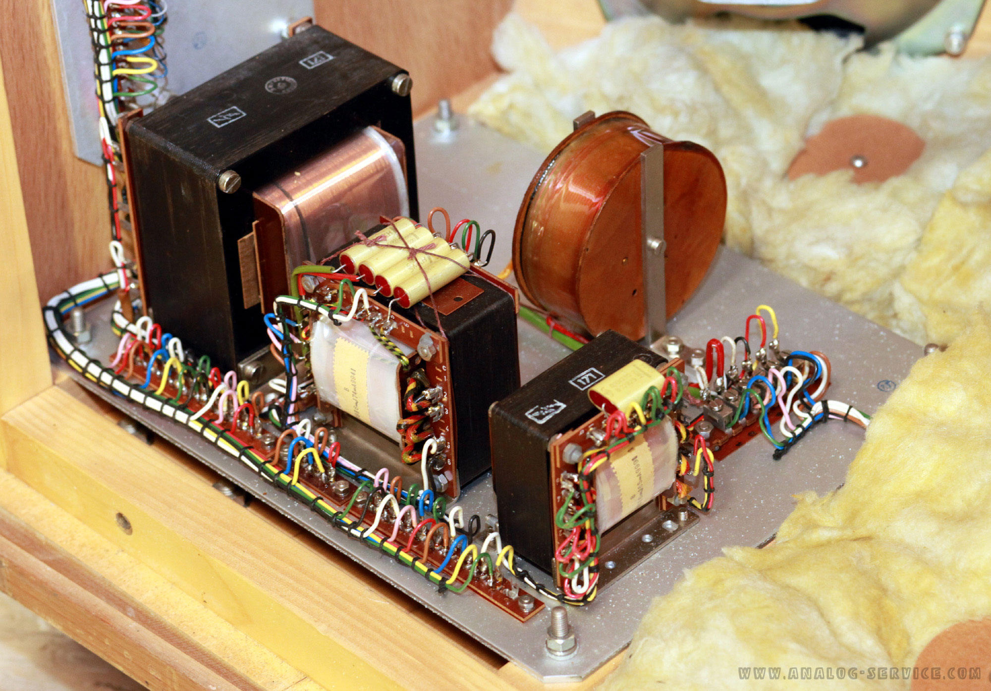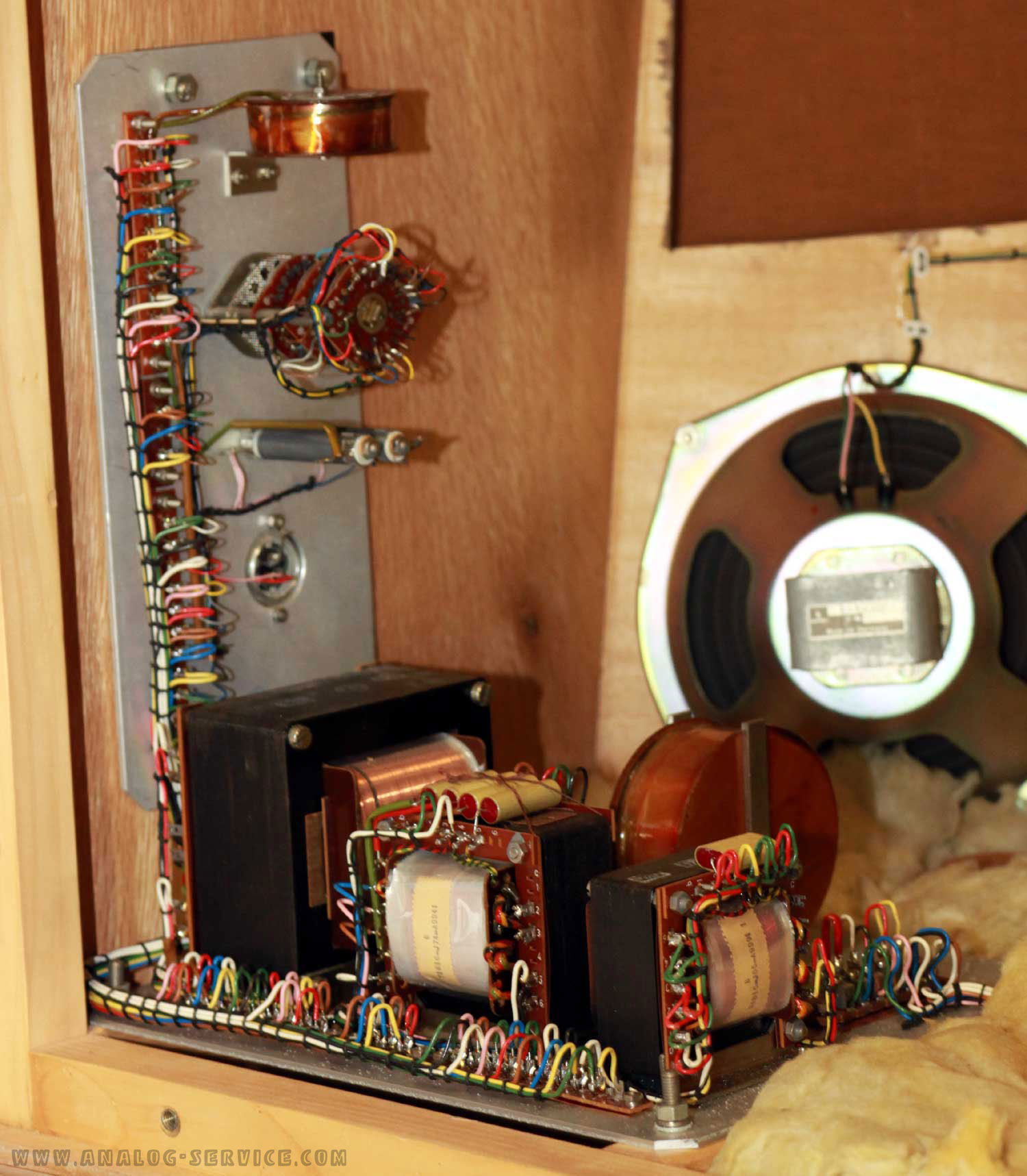 Das wunderschöne Innenleben. Unten links sind die Bauteile des Anschlussfeldes sowie die Frequenzweiche zu sehen.
